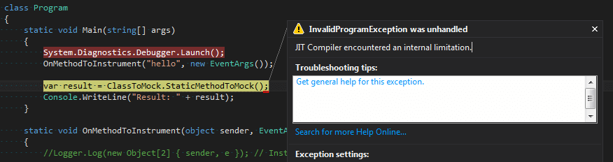And that is the basics of how you can modify any .NET method, it seems relatively simple when you know how! In my simple demo I just add in the relevant IL so that a mocked method is called instead, you can see the C++ code needed to achieve this here. Of course in reality it’s much more complicated, my simple demo only deals with a very simplistic scenario, a static method that returns an int. The commercial products that do this are way more powerful and have to deal with all the issues that you can encounter when you are re-writing code at the IL level, for instance if you aren’t careful you get exceptions like this: