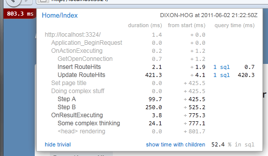 - MiniProfiler - which gives developers an overview of where the time is being spent when a page renders (front-end, back-end, database, etc)